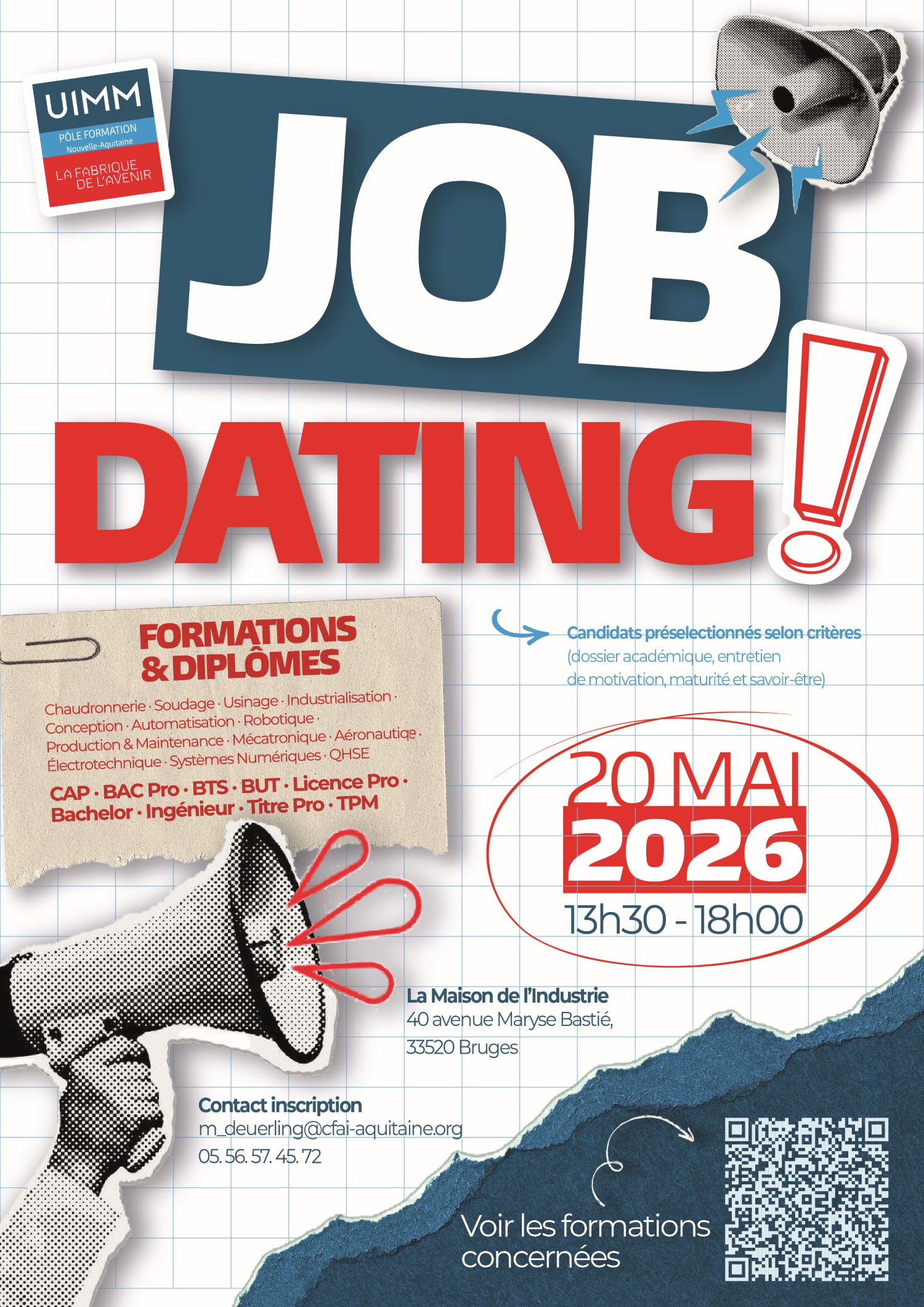 Le Pôle Formation Nouvelle-Aquitaine a le plaisir d'inviter ses entreprises partenaires à une après-midi d'échanges privilégiés le mercredi 20 mai 2026 avec ses futurs apprentis. Organisé au sein de la Maison de l'Industrie (40 avenue Maryse Bastié, 33520 Bruges), cet événement est l'occasion idéale pour sourcer vos futurs collaborateurs parmi nos apprenants qualifiés.